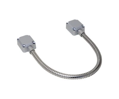 Pasacables exterior para el paso directo de los cables entre la hoja y el marco. Tubo flexible de acero cromado con terminales de fijación de aluminio fundido.