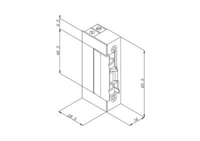 Abrepuertas eléctrico simétrico - reversible, ideal para electrificar puertas de aluminio o madera con picaporte mecánico y cerraduras de palanca sin tener que hacer un corte en el montante para el movimiento del labio durante la apertura (el labio móvil que bloquea el picaporte, durante la apertura no se mueve girando hacia fuera como en los abrepuertas eléctricos tradicionales, sino que gira deslizándose hacia dentro). Bloqueo del picaporte ajustable horizontalmente. Bloqueo sin alimentación. Se suministra sin placa de cierre.