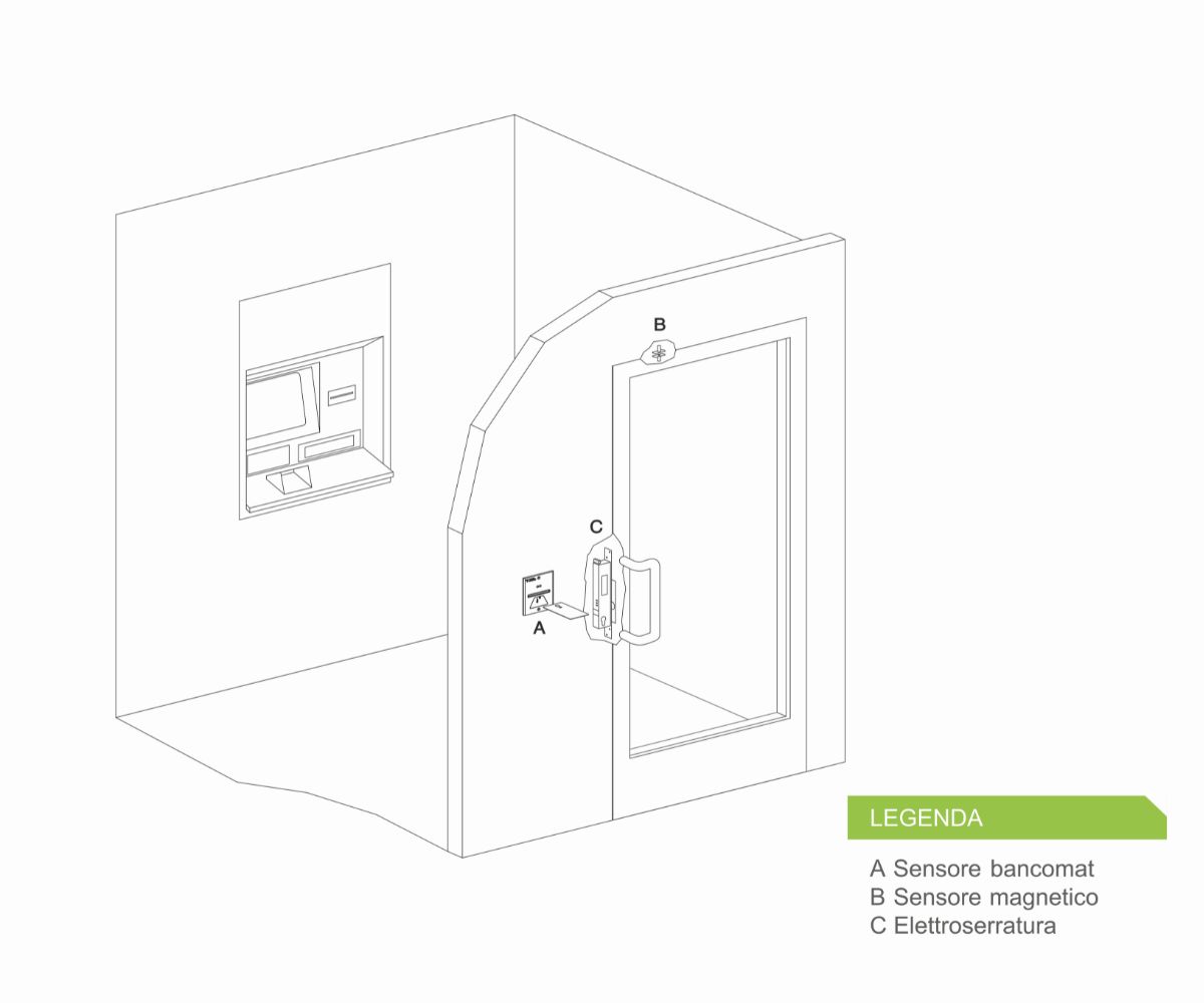 Electrónica de gestión para cajero automático y lector de tarjetas de crédito para zona de autoservicio. A petición, es posible especificar el código ABI para la apertura utilizando sólo la tarjeta del banco específico indicado.