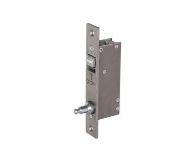 Innovativa elettroserratura per porte scorrevoli a una o due ante, anche motorizzate, e cancelli scorrevoli, con inserimento del perno di blocco frontale. Interamente in acciaio inox, con elevata resistenza all’effrazione, è comandabile elettricamente per la chiusura controllata di ante scorrevoli. È bloccata in assenza di alimentazione, con apertura limitata alla durata dell’impulso con limitatore di corrente e possibilità di apertura meccanica tramite cilindro europeo. La controserratura è dotata di perno retrattile a porta aperta e sistema di fuoriuscita del perno a porta accostata. Non necessita di elettronica di gestione ed è abbinabile a citofoni e a sistemi per controllo accessi.