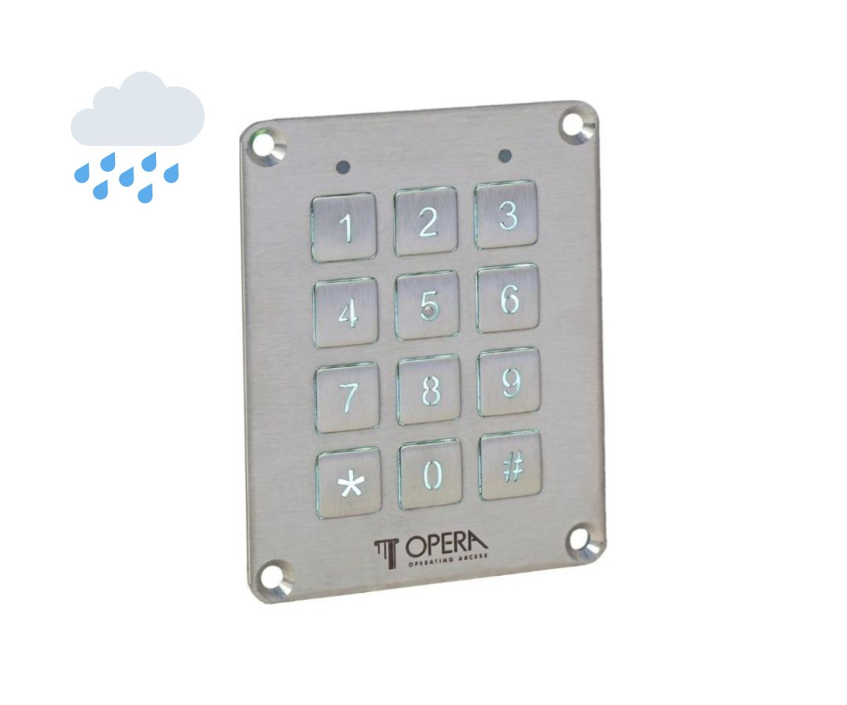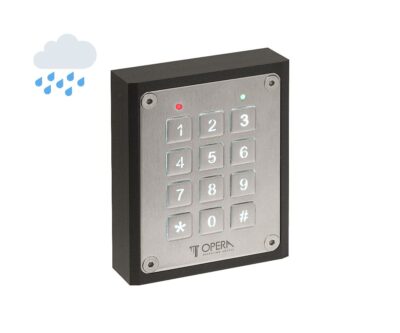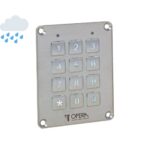 Tastiera a codice a 10 tasti numerici retroilluminati con luce bianca più un pulsante di Enter. Disponibile nella versione da infilare o da applicare con scatola in ABS di colore nero e buzzer interno per la segnalazione di avvenuta pressione del tasto. Grado di protezione IP 65 per funzionamento alle intemperie.
